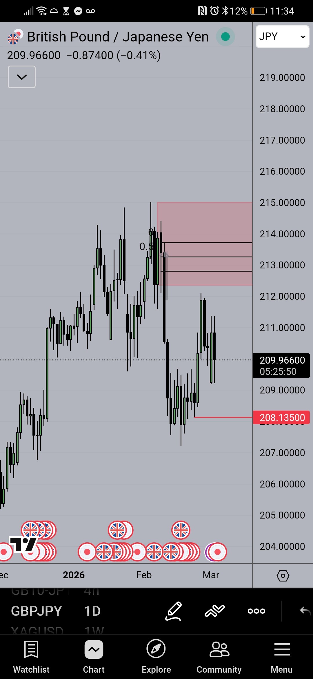 Red line here is my entry and the bottom of the red rectangle is my TP level (35% profit).
