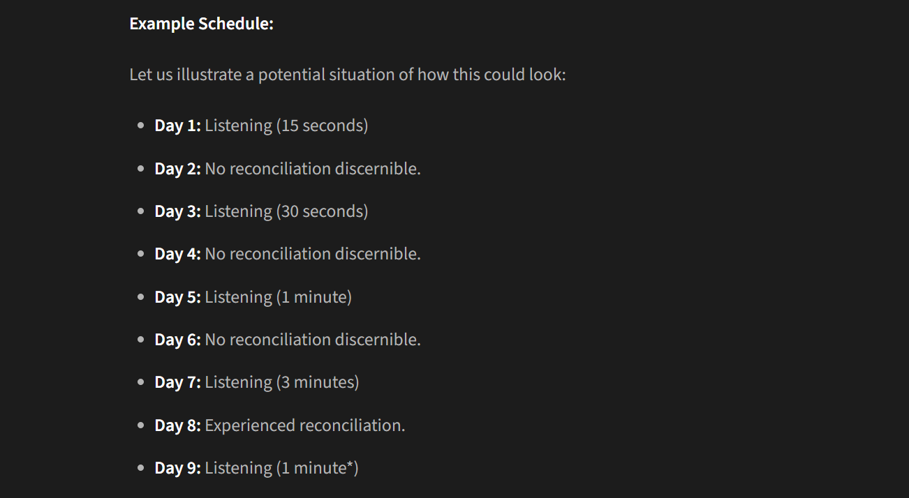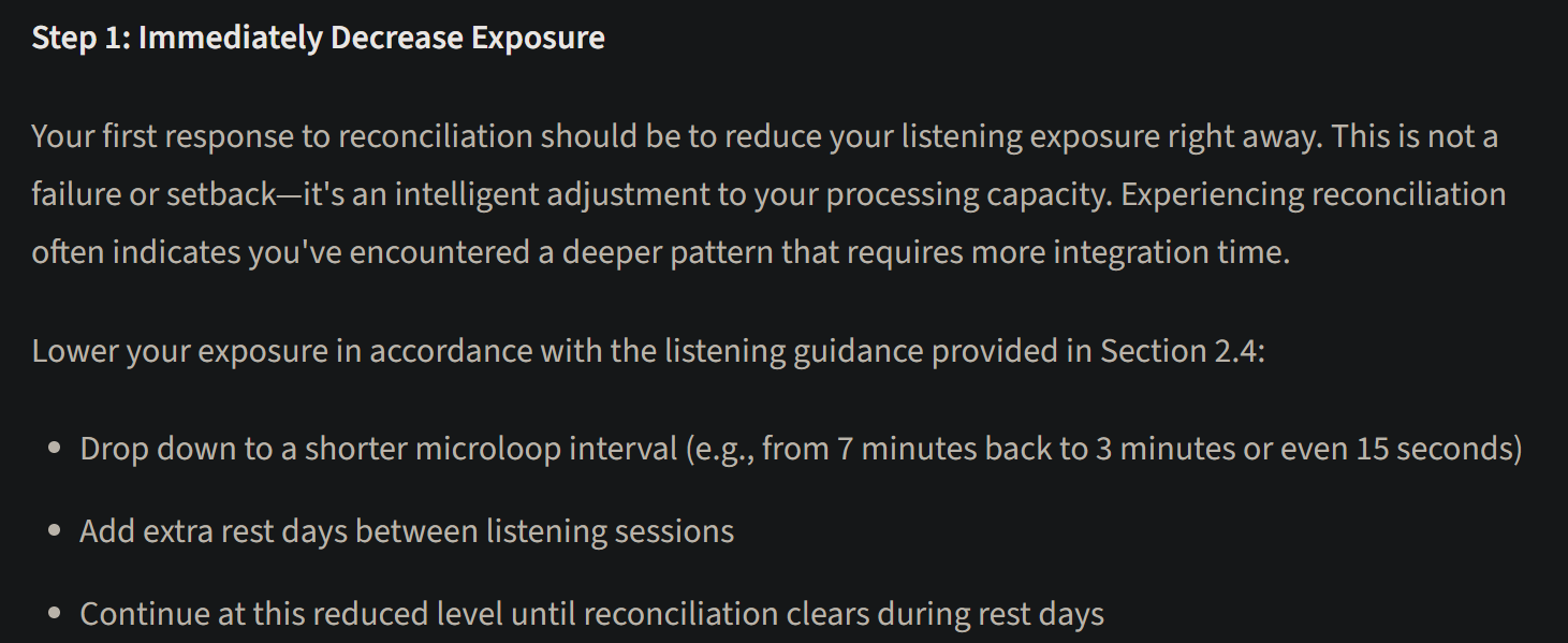 ”… noting at which exposure tier reconciliation occurs and staying at that listening exposure until reconciliation is no longer discernible during a rest day, you would increase exposure to the next interval.”