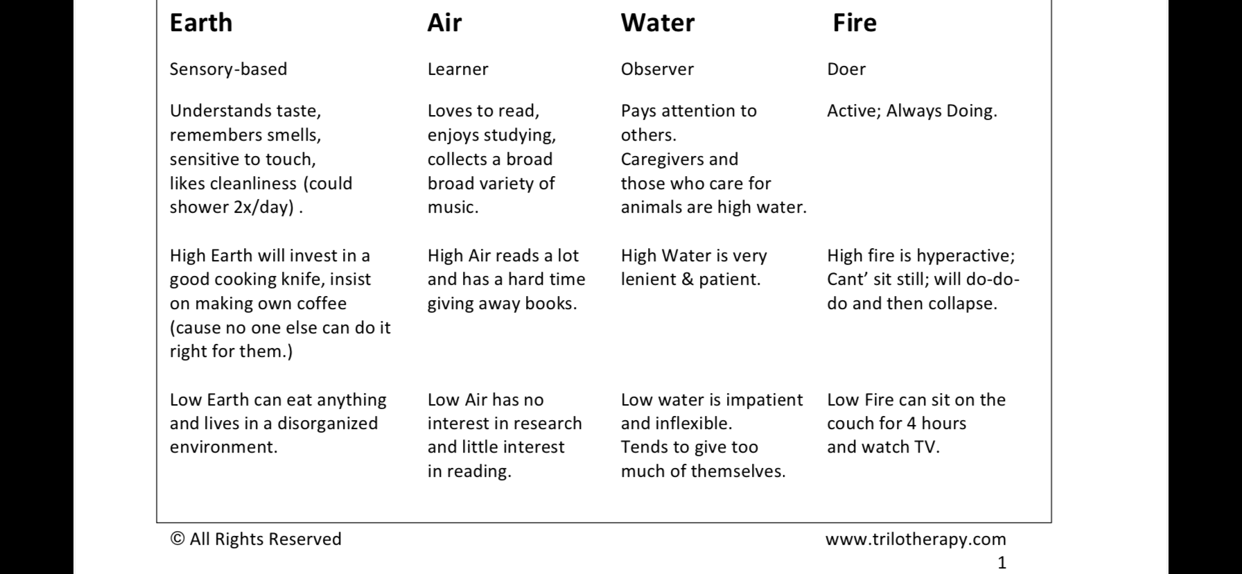 Been recalling more information regarding the 4 elements that I previously studied. Will post more later.