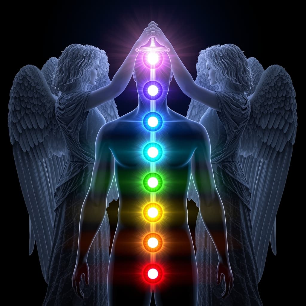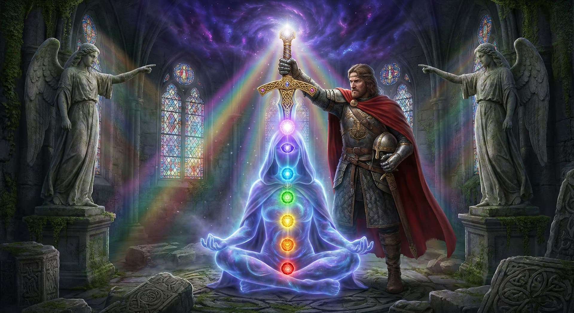 “Cinematic fantasy art of a mystical figure in meditation pose, their body translucent and glowing, with seven luminous chakra points (red, orange, yellow, green, cyan, blue, violet, and white crown) aligned vertically through their body forming a radiant sword blade. The ornate golden sword hilt emerges from the crown of their head, intricate Celtic knotwork designs on the pommel and guard. A heroic King Arthur figure in medieval armor stands beside them, his muscular arm extended, hand firmly gripping the sword hilt with determination, poised to pull the chakra sword free. Two majestic stone angels with detailed feathered wings flank the scene, their hands gesturing toward the crown chakra. Dramatic lighting with ethereal rainbow energy radiating from each chakra point along the sword blade. Dark mystical background with purple and deep blue nebula clouds. Photorealistic rendering, spiritual symbolism, epic fantasy atmosphere, volumetric lighting, highly detailed, 8K quality.”